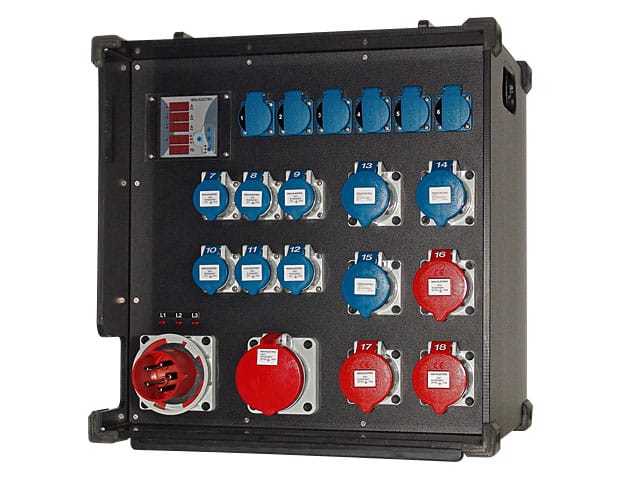 All power distribution boxes of this series can be perfectly stacked. Special fittings prevent the modules from sliding off each other. All eight corners of each distribution box are fitted with soft rubber shock absorbers. As well as protecting the boxes from impact, these prevent surface scratching of the enclosures.